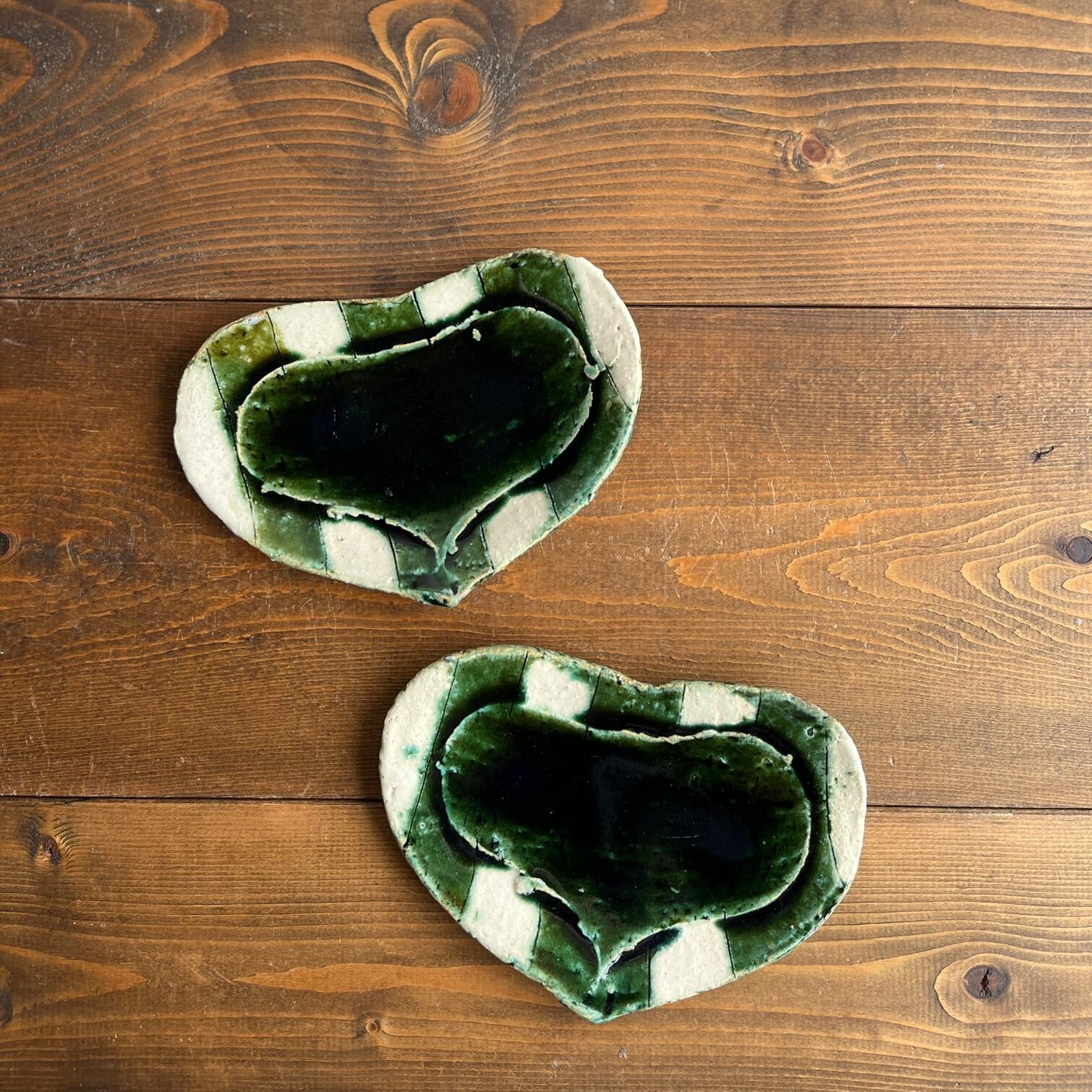 一見斬新にも思えるハートとストライプの組み合わせですが、この織部の色と手作り感溢れる陶器ならではの温かみによって、楽しさはそのままに食卓に馴染む雰囲気になっています。