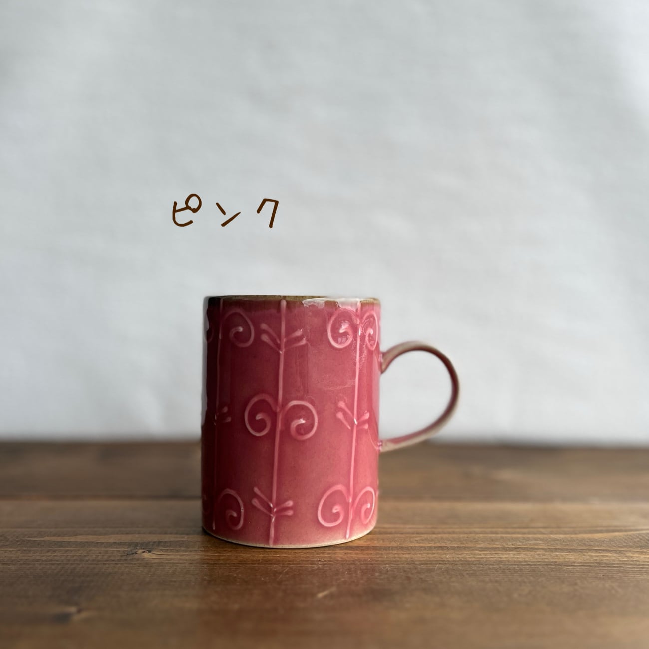 こっくりと深い飴色と、くすんだピンクが大人な雰囲気の素敵なマグカップです。