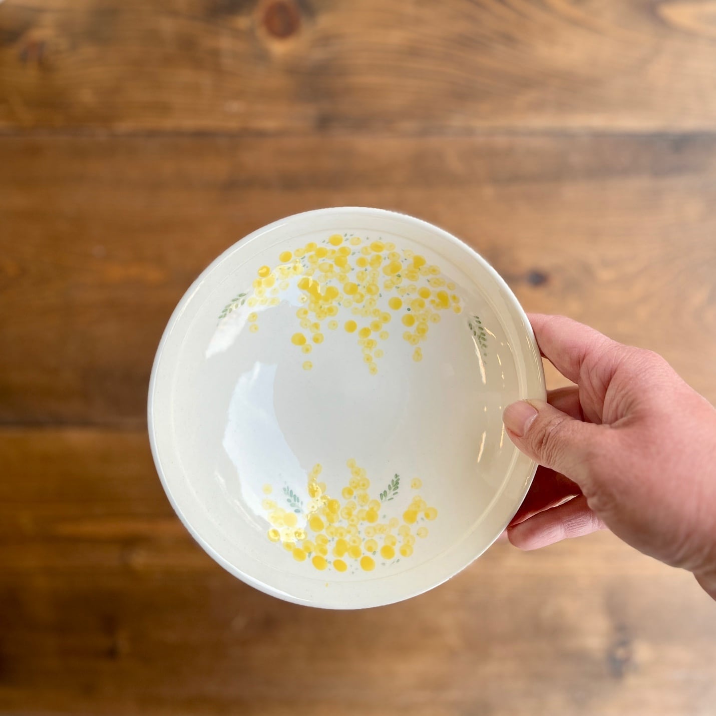 フワフワッと描かれたミモザの優しい黄色には、心もフワッと開く様な温かさがあります。