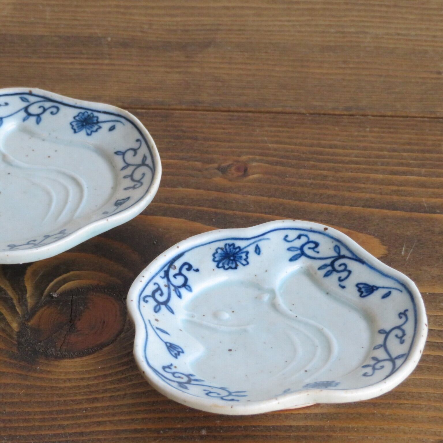 染付(主に磁器に見られる白肌に呉須=コバルトで文様を描く技法)によって描かれた繊細な絵付けと、型押しのリスの模様がとても可愛らしい豆皿です。