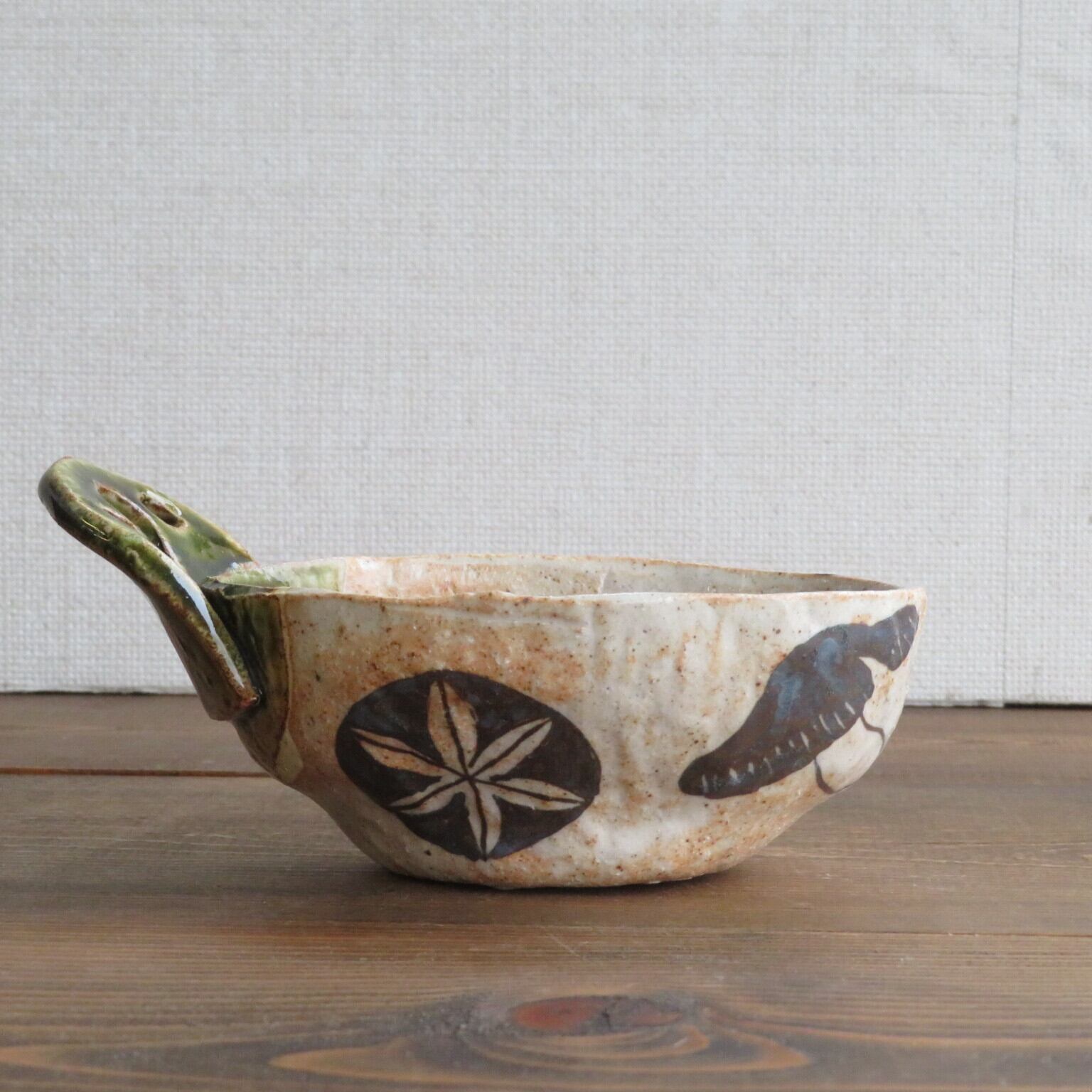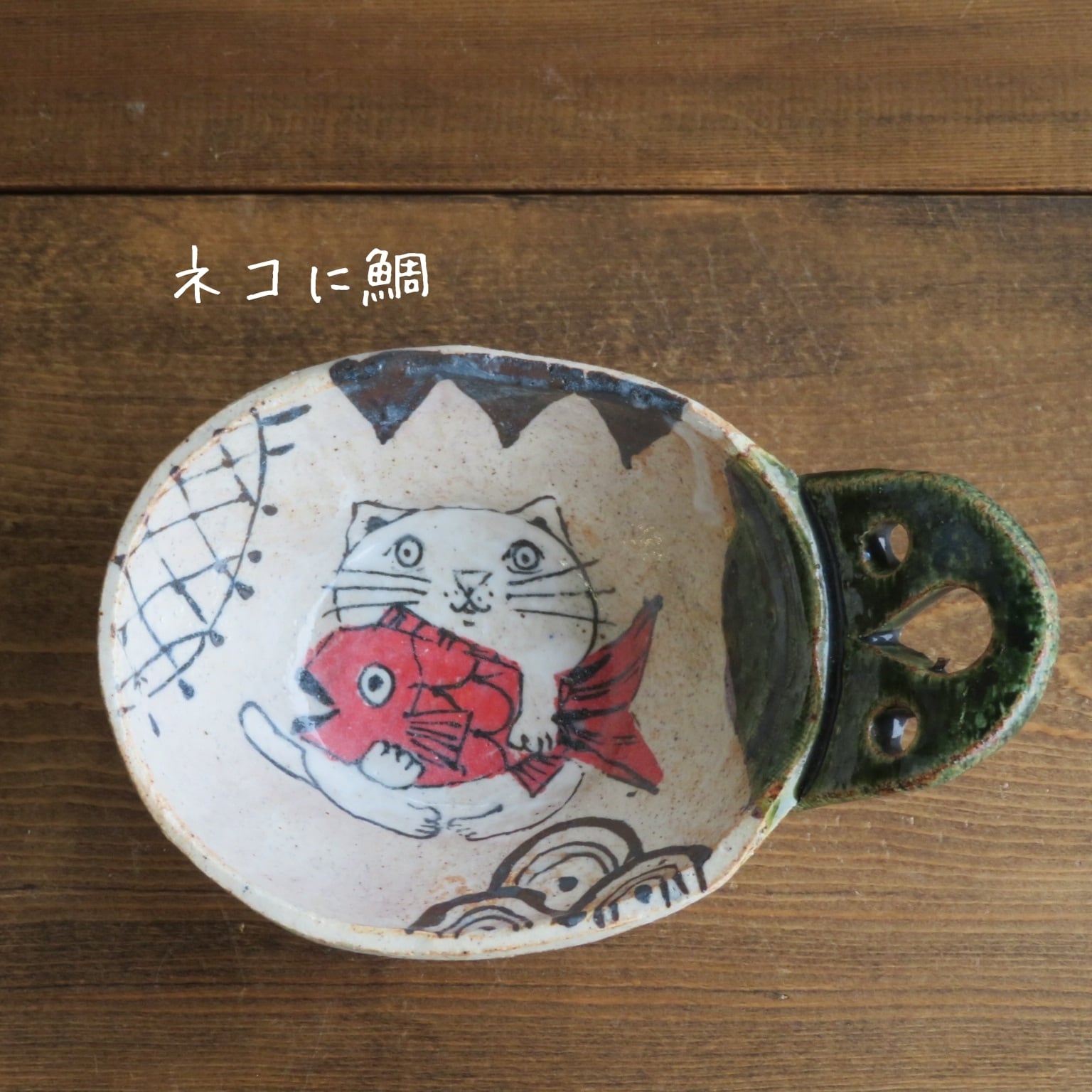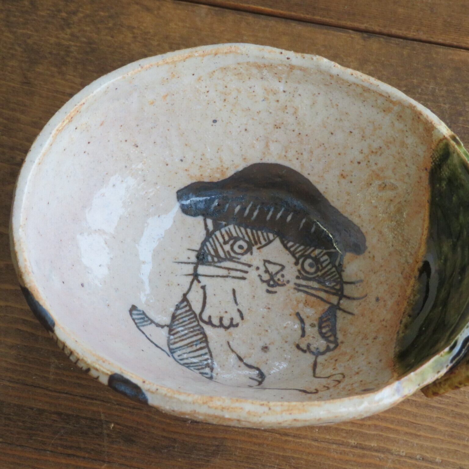 全体の渋い色目で食卓にすっと馴染みつつも、クスッと笑いたくなる絵柄が個性的な器です。