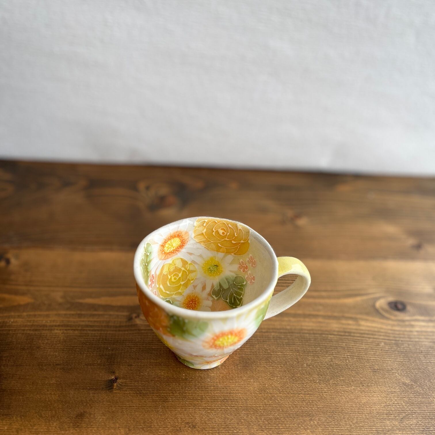 優しい色合いと手描きの繊細な花模様が華やかなマグカップです。